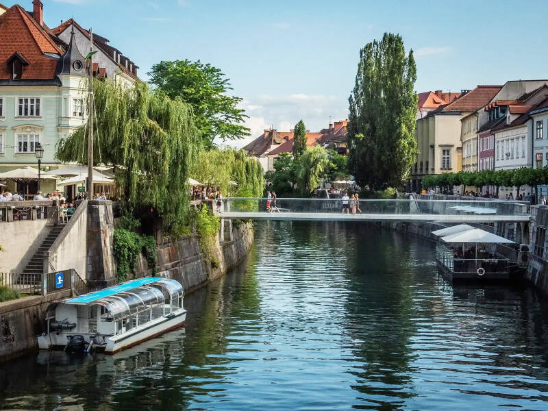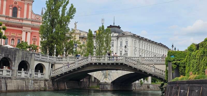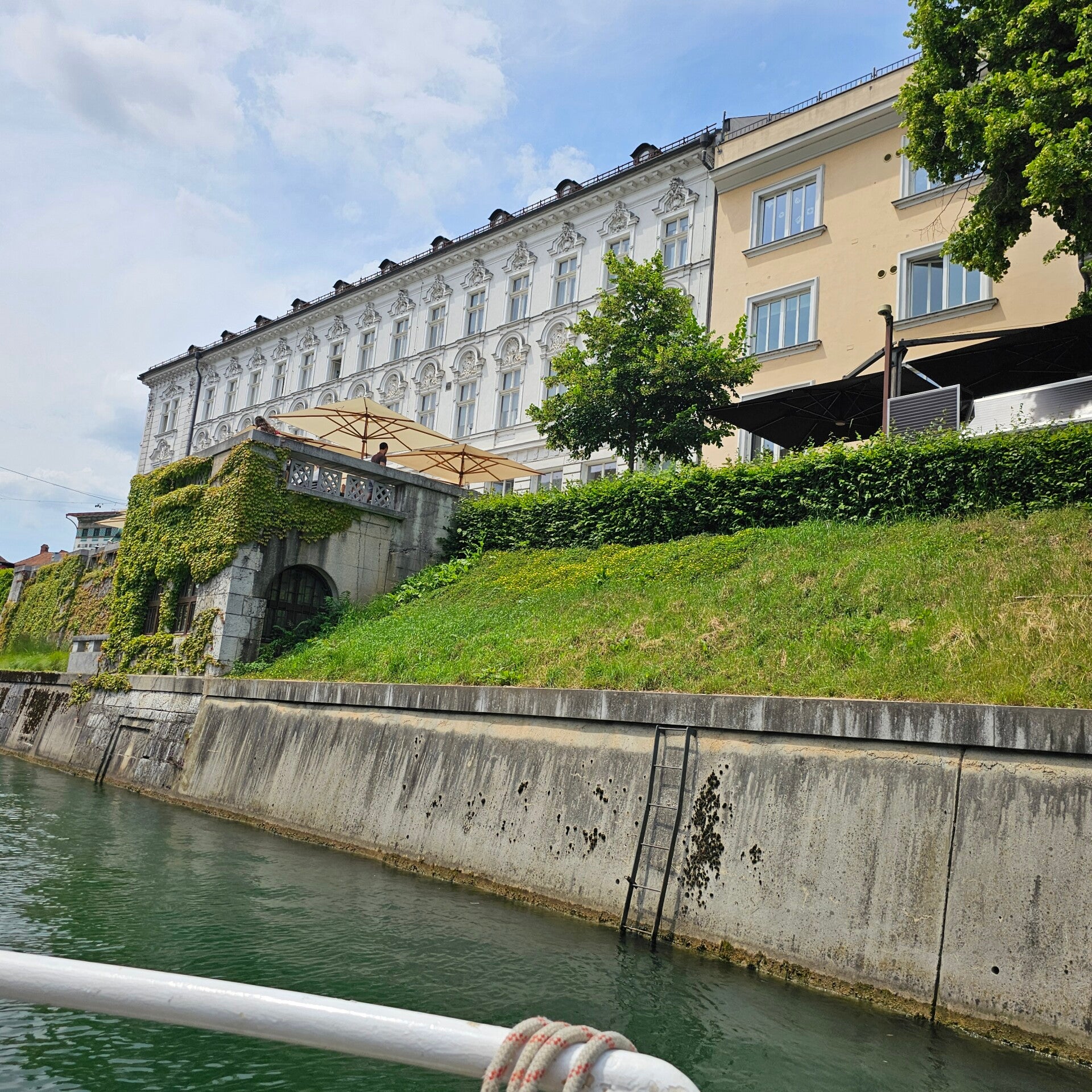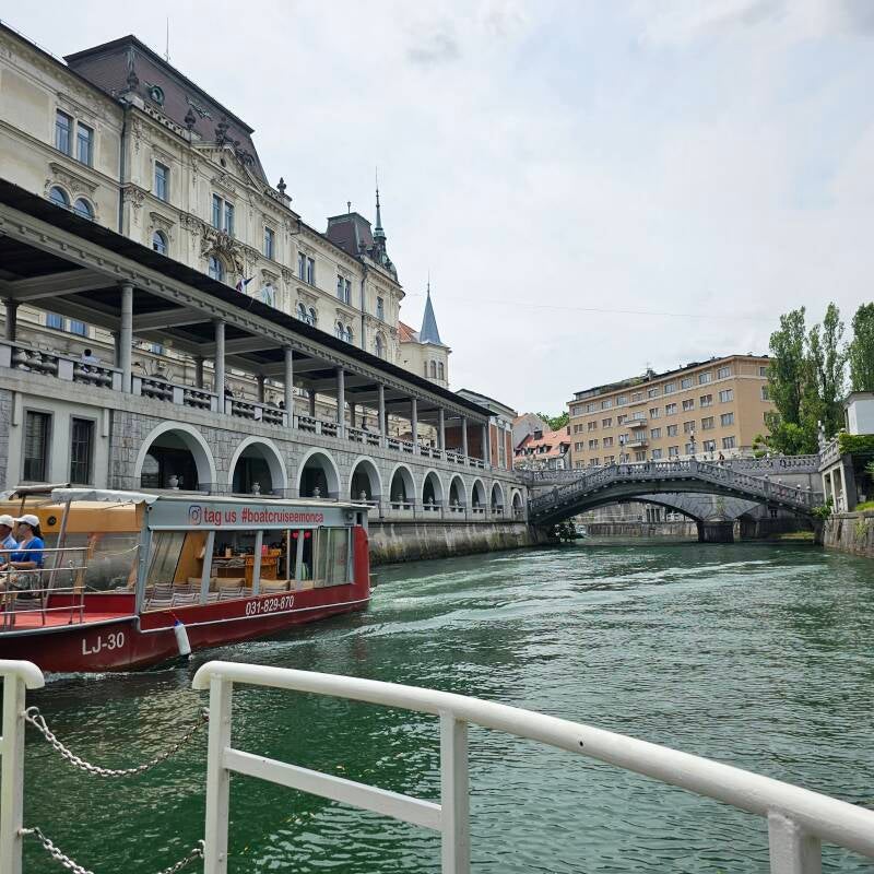 Nachdem wir uns gut eingerichtet haben, rollern wir gleich die 6 km nach Ljubjana und parken an der Drachenbrücke. Es stehen sehr viele Roller und Motorräder hier und so erwarten wir keinen Strafzettel. Wir machen eine Bootsfahrt, weil ich gelesen hatte, dass es einige Kanäle gibt, die mit dem Boot befahrbar sind. Es handelt sich aber nur um einen Kanal, der befahren wird. 3/4 Std. 24 Euro wir beide.