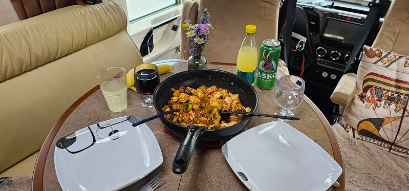 Den Eintritt haben wir gerade noch in bar zusammengekratzt. Wir müssen dringend Geld abheben. Der Eintritt kostet für Thomas 9 Euro und für mich 8 Euro. Um 15 Uhr geht unsere Fahrt weiter zur Seilbahn Golte-Bahn in Mozierski-Radegunda. Dort gibt es einen großen Parkplatz, wo wir übernachten wollen, um morgen mit der Gondel auf den Berg zu fahren. Es soll dort ein schöner Alpengarten sein. Wir stehen am Abend ganz alleine hier. Der Platz ist kostenlos. Früher gab es hier eine VE aber die ist in einem schlimmen Zustand und funktioniert auch nicht mehr. Zum Abendessen gibt es Spaghetti mit Tomatensoße - das muss mindestens einmal sein im Urlaub.