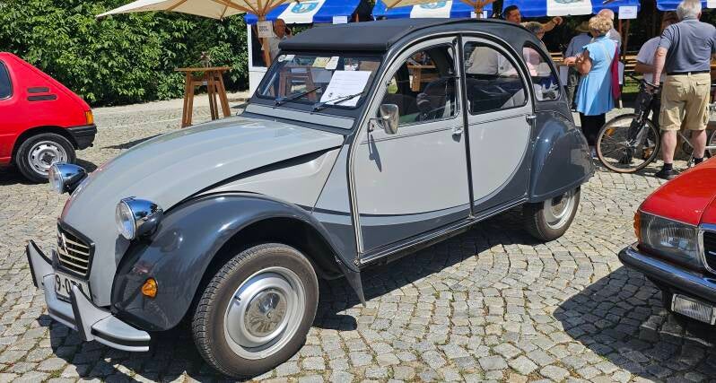 Wir gehen durch einen schönen Park in den Ort und vor der Burg findet ein Oldtimertreffen statt.