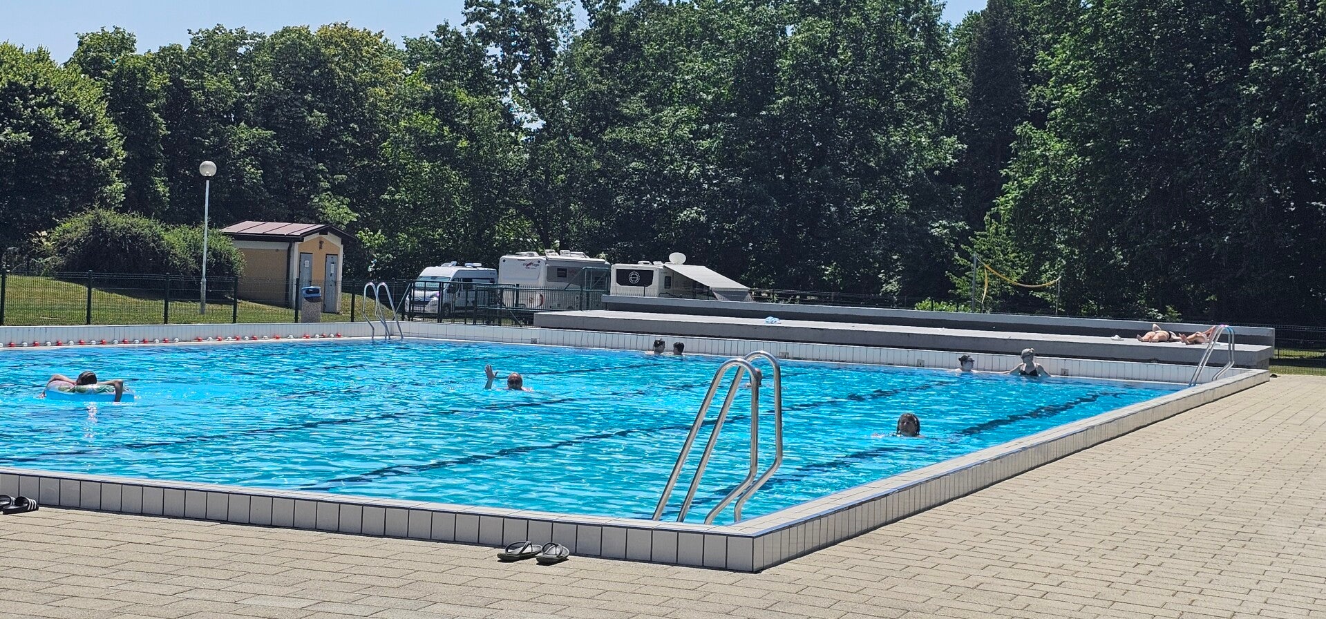 Um 14 Uhr gehen wir in das schöne Freibad. Die Wassertemperatur ist ca. 27°C und so gehe ich auch mal schwimmen bei der Hitze. Wir bleiben bis 18 Uhr obwohl die Musik, die zur Eröffnung gespielt wird, sehr laut ist. Wenigstens unser Geschmack.