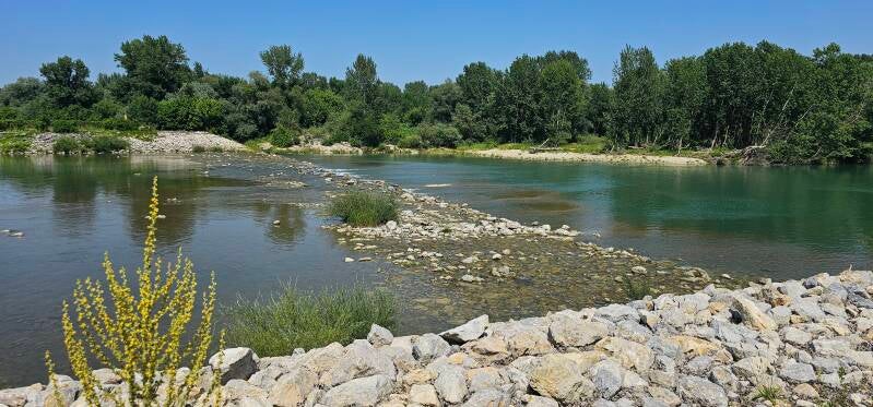Thomas würde gerne den Fluss durchwaden aber ein großer Steinhügel versperrt den Weg.